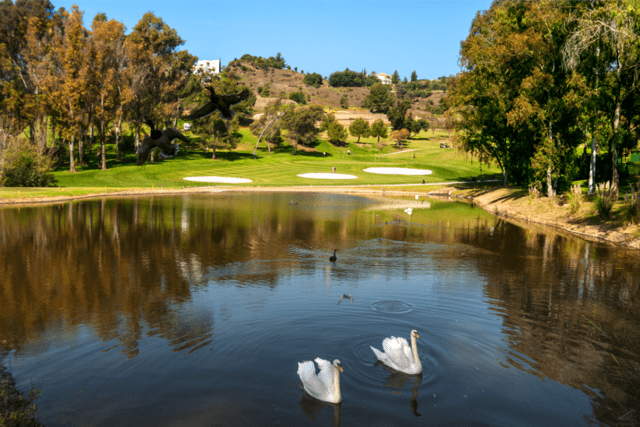 Opened in 1968 and designed by German golf course architect Bernard von Limburger, Atalaya’s Old Course is one of the most beautiful golf courses on the Costa del Sol. The wide, generous fairways meander gently between mature trees and flowering shrubs, providing shade and color all year round. The often elevated greens make club selection interesting, and their subtle contours require careful judgment to sink those important putts. The Old Course offers magnificent views of La Concha and the Mediterranean Sea, as well as lakes and streams populated by many species of waterfowl, including our two resident pairs of swans.